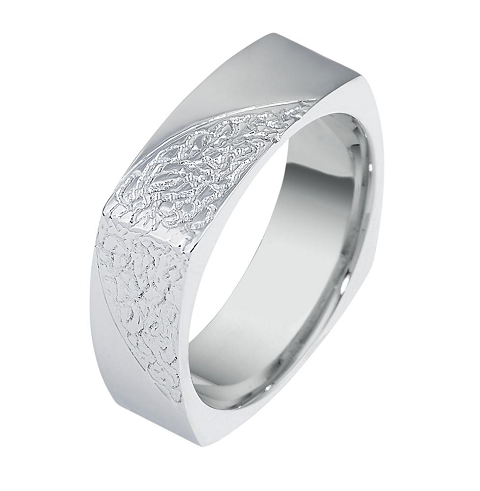 Desi la prima impresie verighetele patrate nu par a fi cele mai elegante bijuterii, datorita colturilor si liniilor rigide ce caracterizeaza aceste inele, exista totusi variante care denota gratie si rafinament. Este cazul verighetei din imaginea de mai sus care are un farmec aparte prin „fina broderie" realizata in aur alb, prin tehnica filigranului.