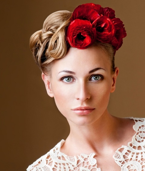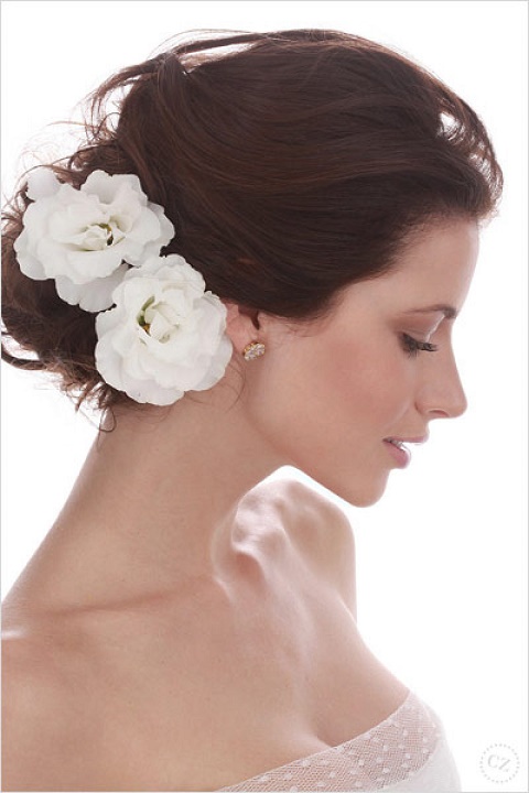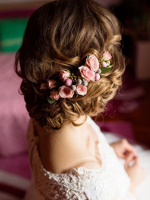 La o astfel de coafura de mireasa merg de minune trandafirii prinsi la intamplare" in par, fie ca vorbim despre cei rosii, albi sau roz!