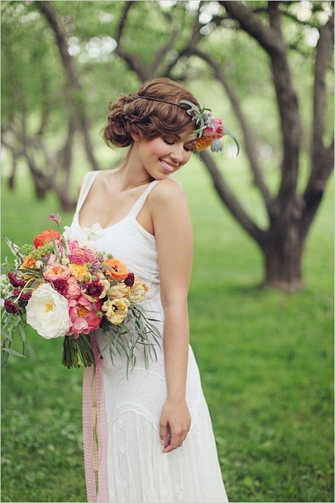Coronitele din flori se potrivesc de minune si la rochiile de mireasa retro. Poti arata mirific intr-o rochie alba cu bretele si insertii de dantela care sa-ti acopere corpul in falduri suave, cu un machiaj natural pe chip, iar parul ondulat sa-ti fie prins intr-o bentita cu flori tip coronita.