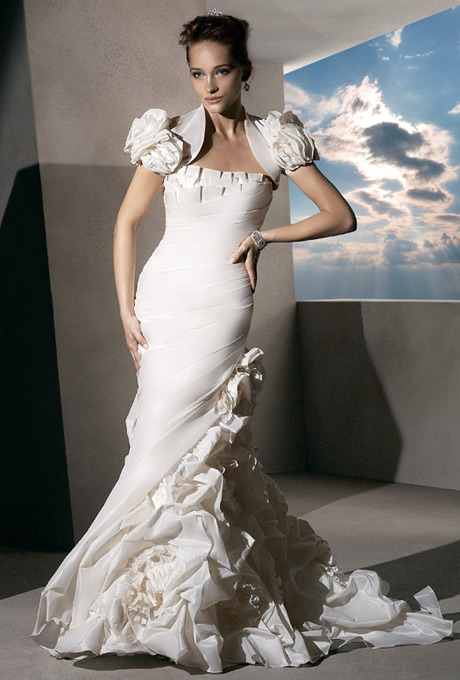 Rochiile mulate pe corp denota foarte multa senzualitate si gratie, iar materialul din care acestea sunt confectionate pot creste calitatea acestora. Intorcandu-ma din nou la satin, iti prezint acesta rochie de mireasa sirena, ce are corsetul incrustat cu pietre semipretioase, acestea regasindu-se razlete si pe faldurile rochiei.