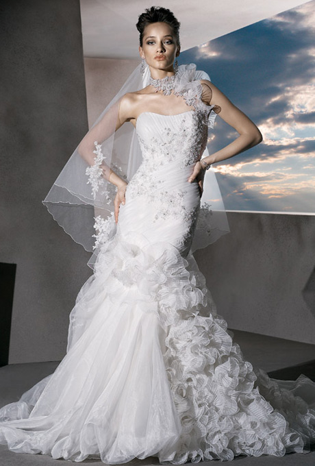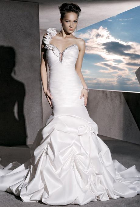 Visatoarele pot alege o rochie de mireasa timp sirena care sa creioneze imaginea perfecta a valurilor inspumate ale marii, asa cum sunt faldurile tinutei de mai sus. Totusi, trebuie remarcat echilibrul perfect dintre formele bine definite ale corsetului care acopera partea de sus a corpului, coborand cu linii si falduri diforme de la genunchi in jos. Fina broderie a acestei rochii aduce un plus de rafinament tinutei.